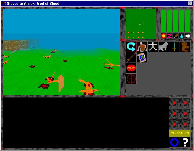 Three Toe attacked the kobold town of Southern Spirit over 30 times with different characters (occasionally with gigantic beasts). The bodies in this screenshot accumulated over the course of these games (some of the bodies belong to the old characters).